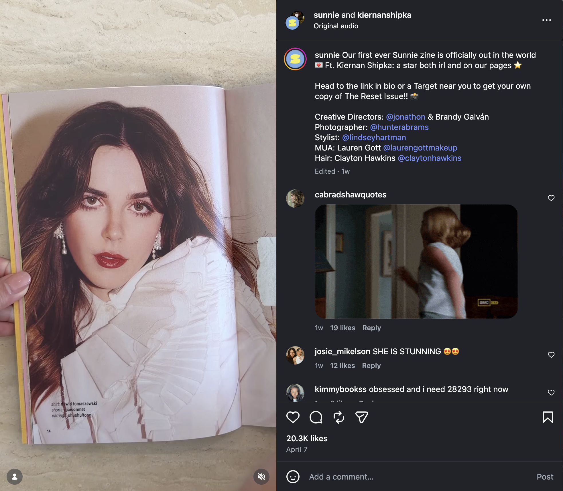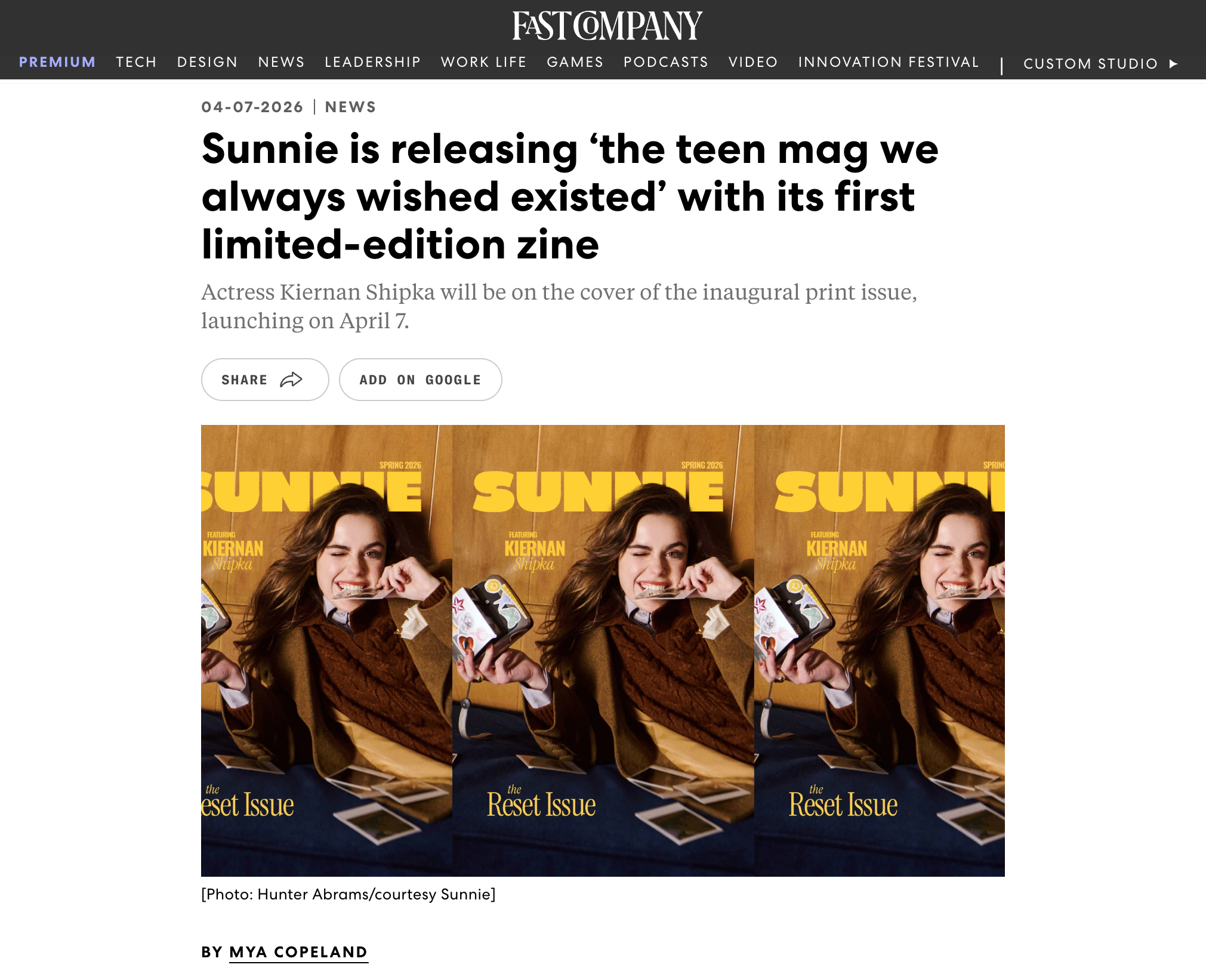 Sunnie expanded its multimedia and experiential brand into print with the launch of its first-ever zine, a limited-edition 50-page issue distributed nationwide in Target stores and online. The debut issue features actress Kiernan Shipka on the cover and introduces a new editorial extension of the Sunnie ecosystem: designed to deepen connection through offline, tactile storytelling.